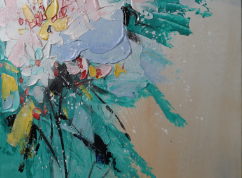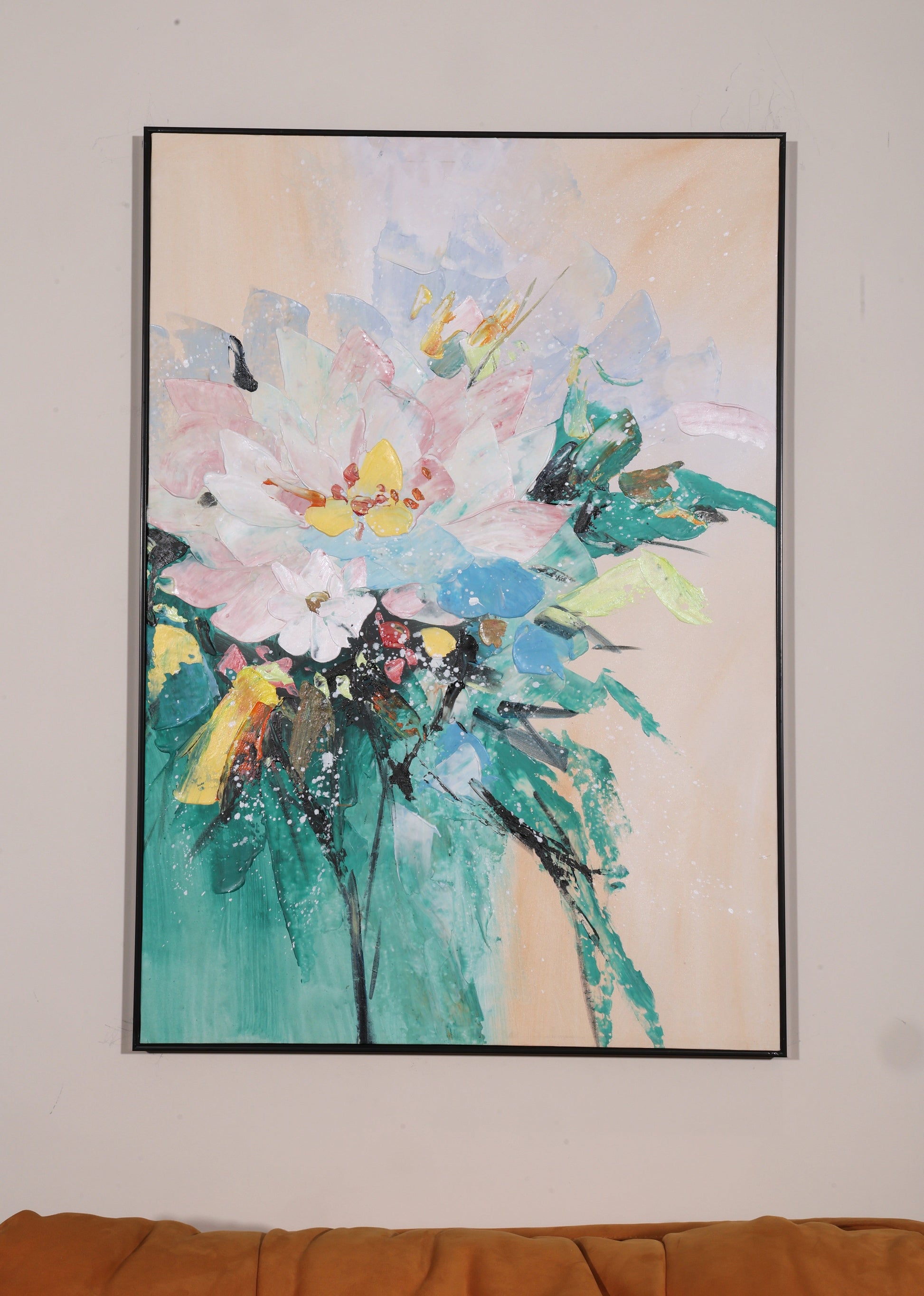 "Pale Peach/Apricot (Background) Teal/Mint Green Soft Pink/Blush Off-White/Pale Cream (Flower petals) Bright Yellow/Lemon Yellow (Center accents) Hints of Light Blue"
