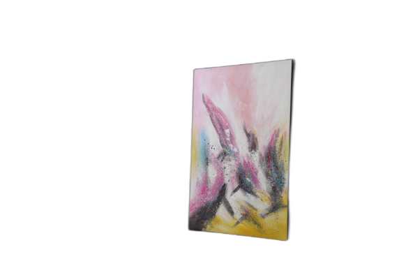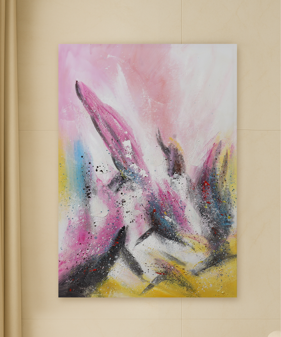 "Hot Pink/Magenta: The primary dominant color, used in strong, sweeping strokes. Bright Yellow/Lemon: Provides a warm, glowing contrast in the lower and upper sections. White/Pale Pink: The main background and blending color, softening the top edge. Black/Dark Gray: Used for strong contrast, texture, and dark splatters. Blue/Aqua: A small, cool accent color that adds complexity to the center."