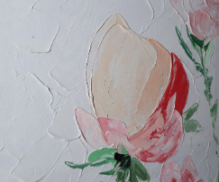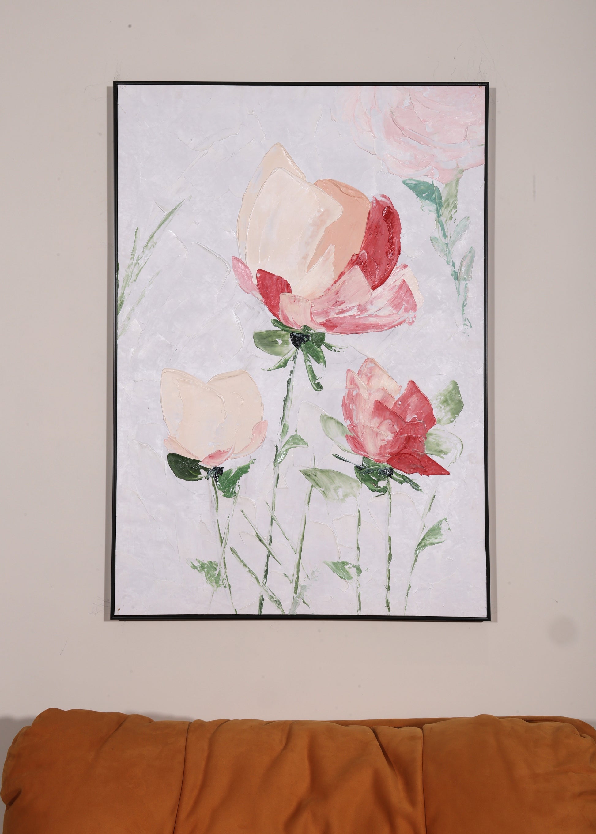 "Pale Dusty Pink/Blush Muted Rose Red/Deep Pink Soft Cream/Pale Yellow (Flower Petals) Off-White/Light Gray (Background) Pale Sage Green (Stems and leaves)"