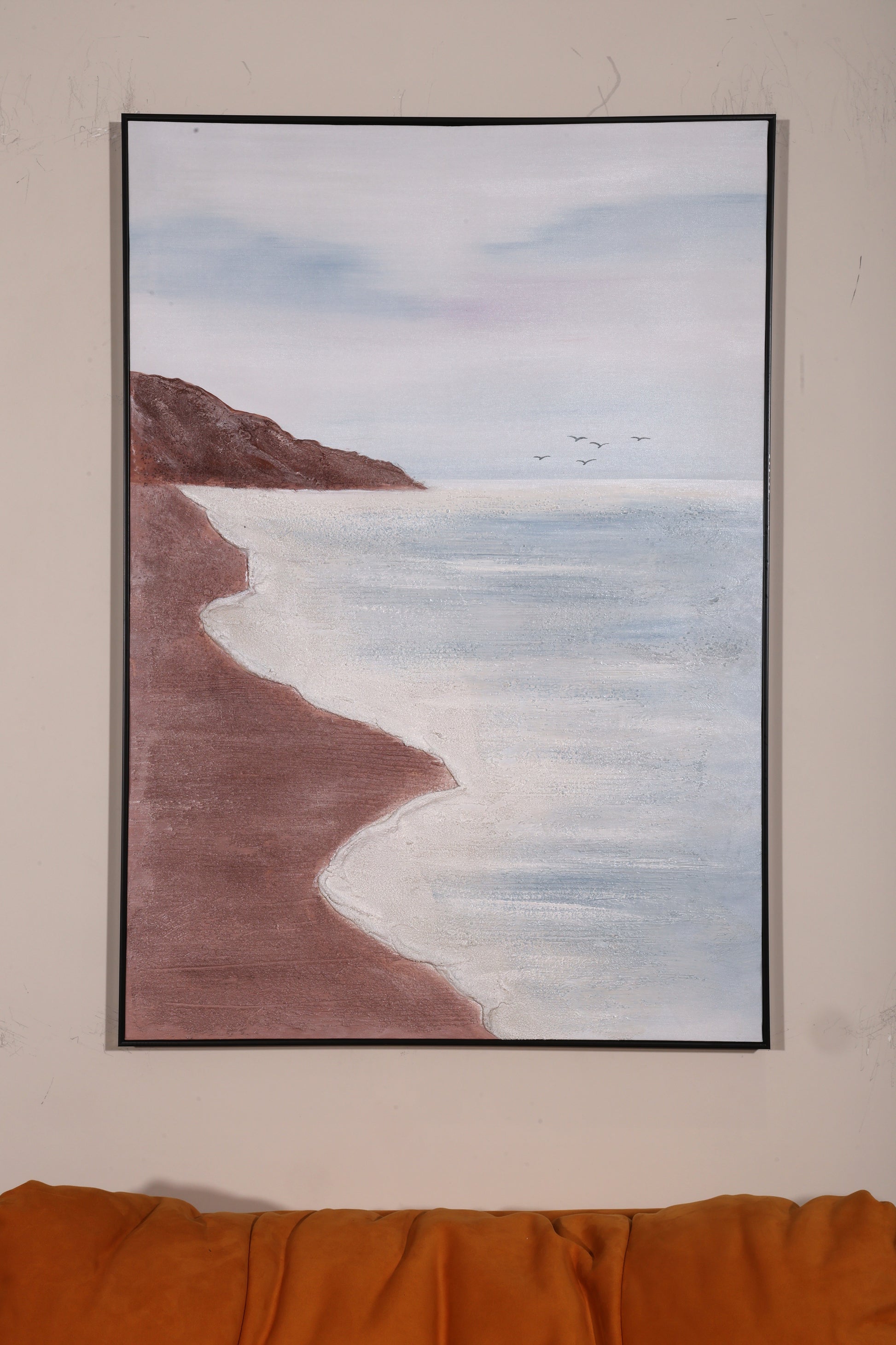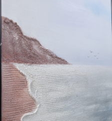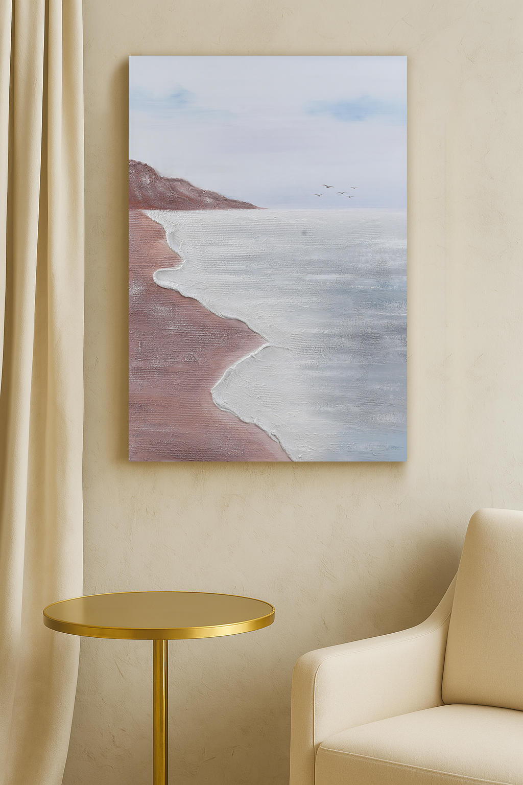 "Dusty Rose/Brown (Beach and Cliff) Muted Blue/Pale Aqua (Water and Sky Accent) Soft Gray/Off-White (Dominant Sky and Sea Foam) Warm Beige (Wall Color)"