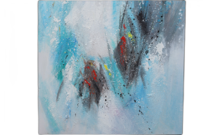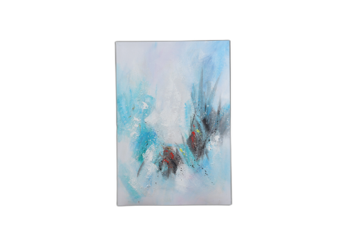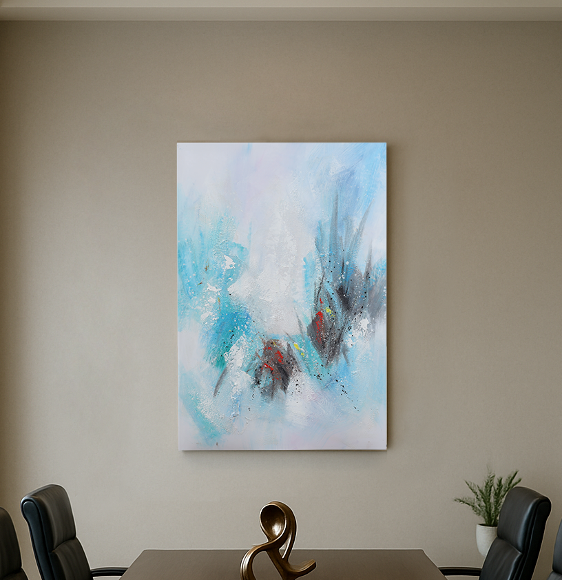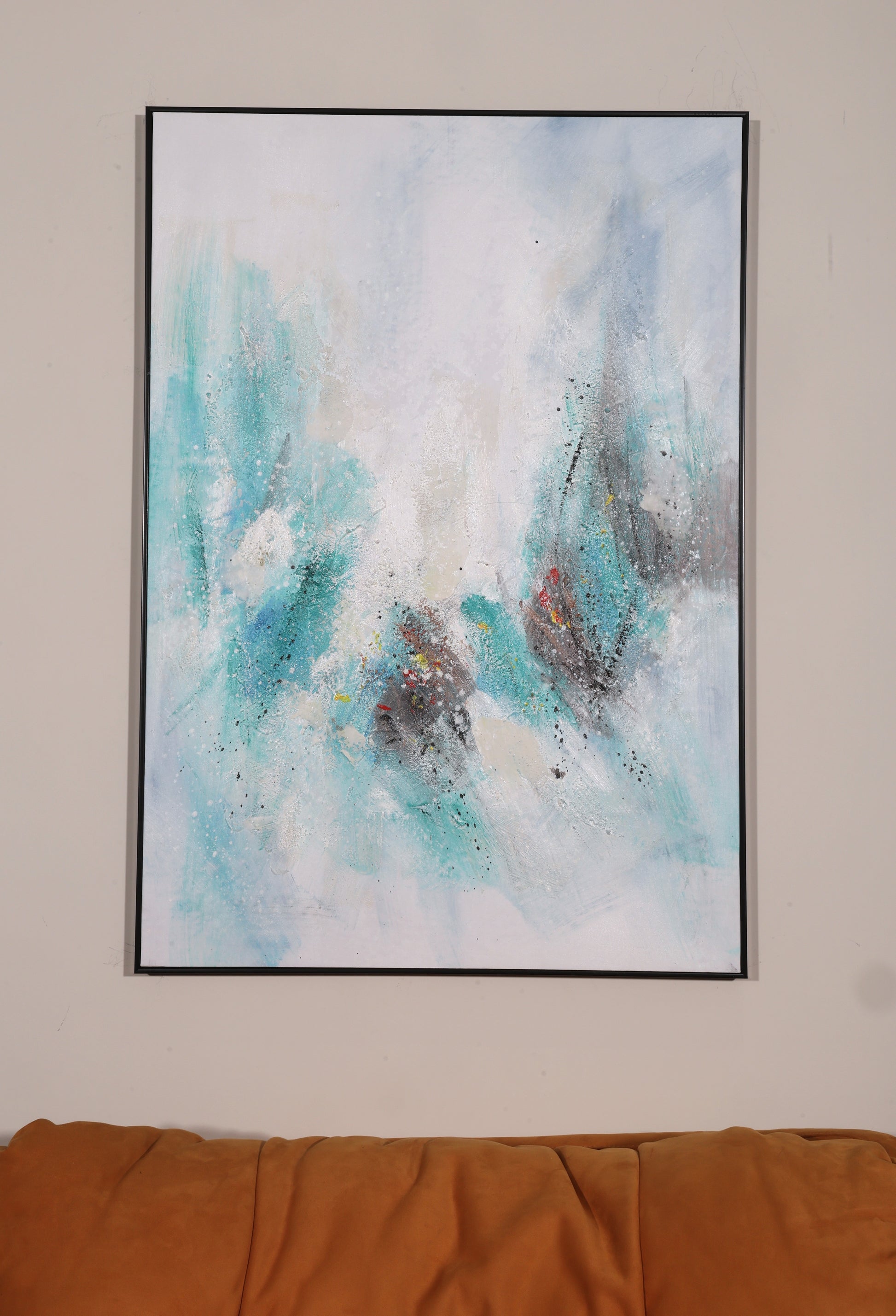 "White/Off-White (Dominant Background and Highlights) Teal/Aqua (Primary Cool Accent Color) Dark Gray/Black (Contrasting Splatters and Texture) Subtle Yellow/Red (Tiny color specks for detail/pop) "