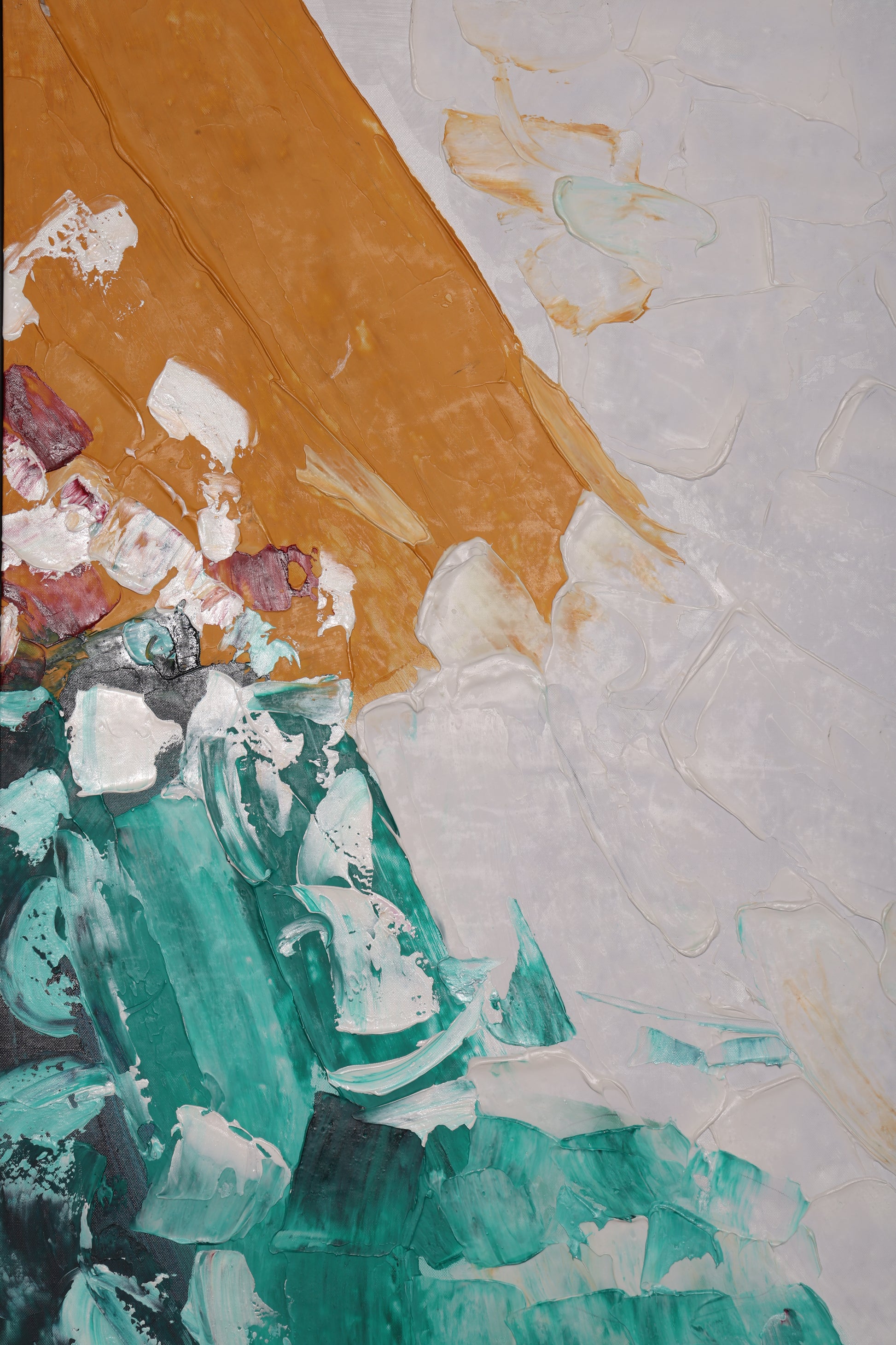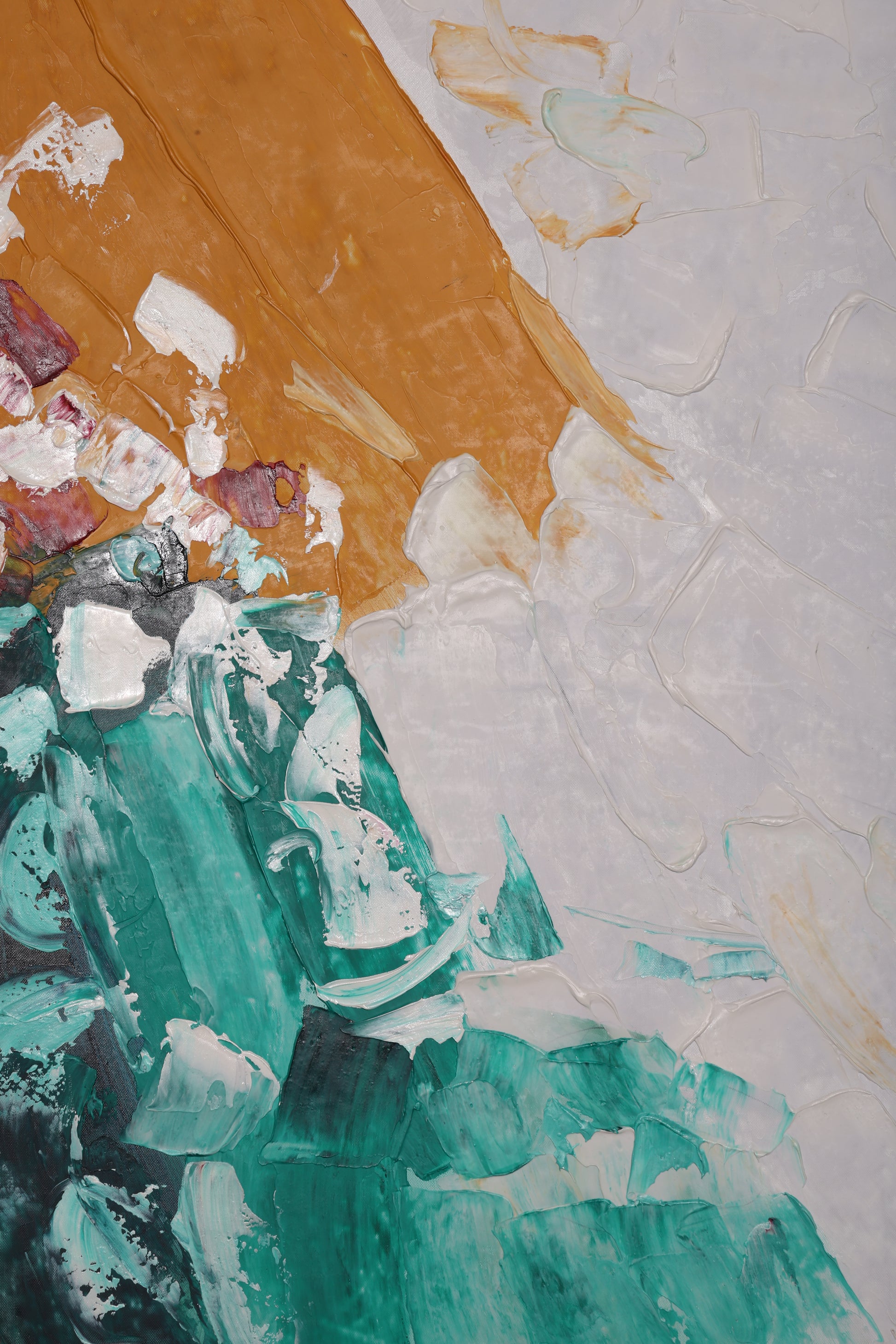 "Deep Ochre/Burnt Orange Vibrant Teal/Emerald Green Pure White/Off-White Light Peach/Pale Pink (Accents)"